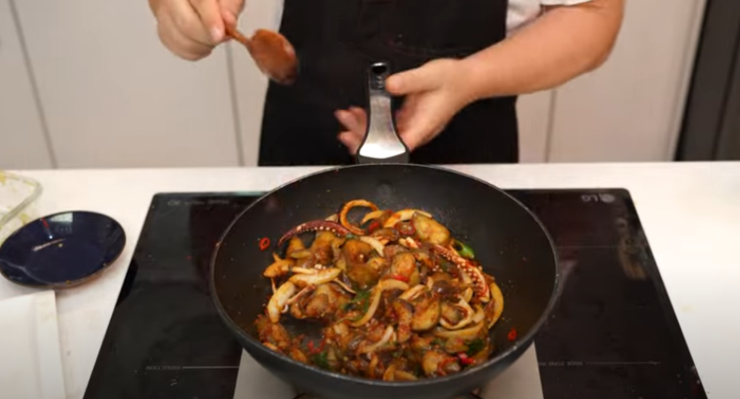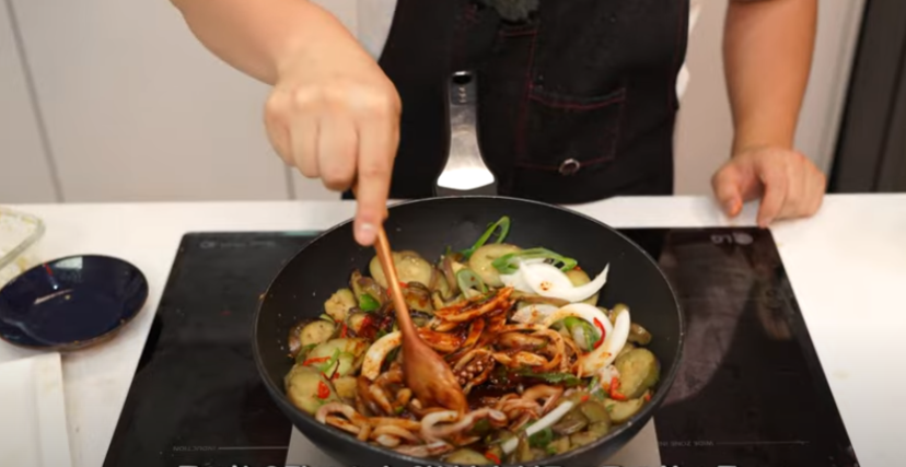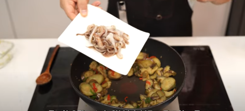 절여서 볶는 가지는 꼬들꼬들한 식감이 아주 좋은데요 수분감없이 충분히 볶아졌다면 오징어를 넣어 준 후
