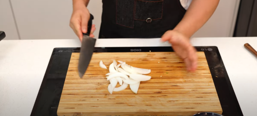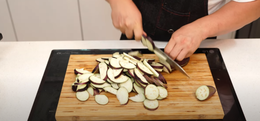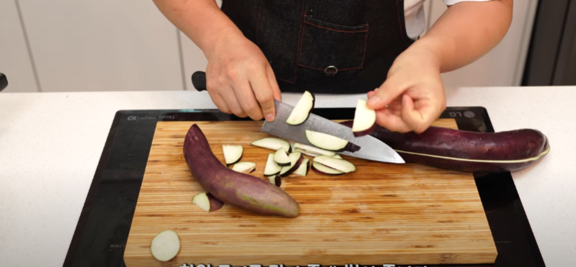 가지가 크거나 굵은 가지는 반을 갈라 0.5cm 두께 한입 크기로 먹기 좋게 썰어줍니다. 넓은 볼에 썬 가지를 담아 준 후