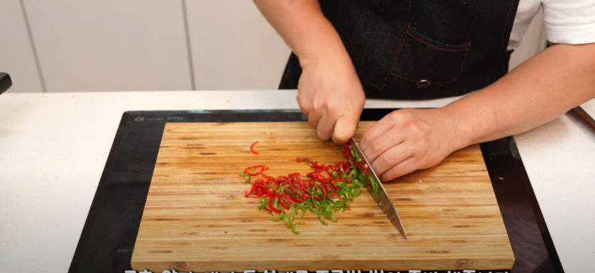 가지를 약 10~15분간 절이는 동인 부재료를 손질합니다. 청, 홍고추는 씨를 배고 송송 썰어줍니다.