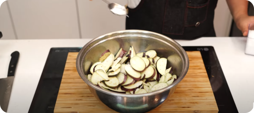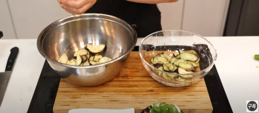 소금 1T 넣어 가지를 절여 줍니다,그대로 사용하기보다 소금에 절여 수분을 뺀 후 조리하면 쫄깃한 식감을 줍니다.