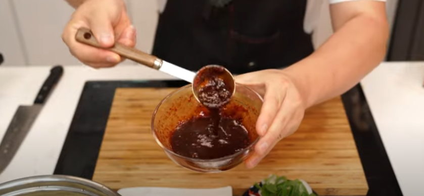 볼에 진간장 1큰 술,설탕 1큰술, 맛술 2큰술을 넣어줍니다. 색다른 가지볶음에 두반장 1큰술, 고춧가루 1큰술