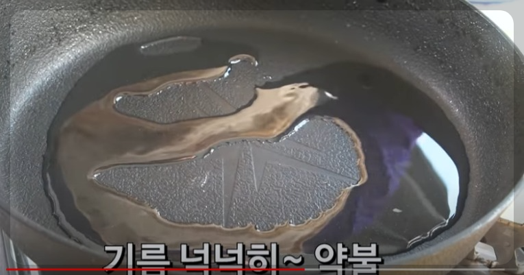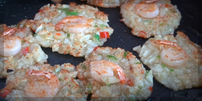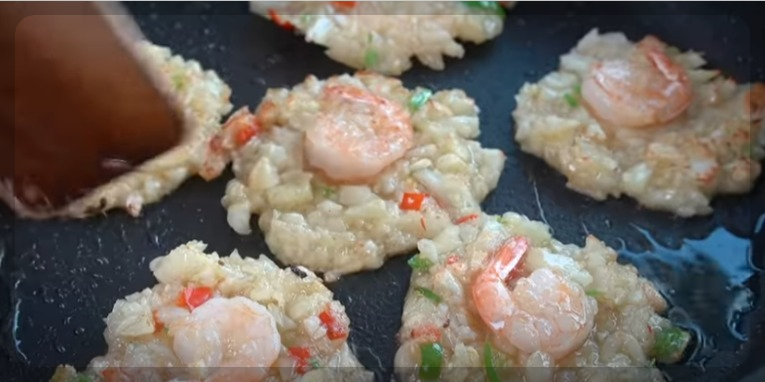 가스불은 약불을 유지해 주면서 기름은 넉넉하게 넣어 반죽을 한 수저씩 떼어 팬에 올려줍니다. 반죽 위에 새우 한 마리씩