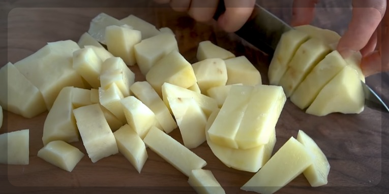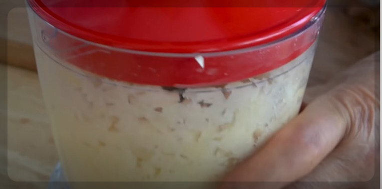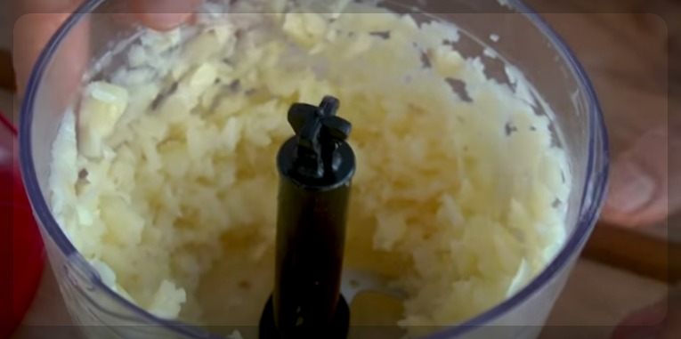 테니스 크기 공만 한 감자 2개를 잘게 썰어준 후 분쇄기나 믹서에 입자가 살짝 남아있게 갈아줍니다.