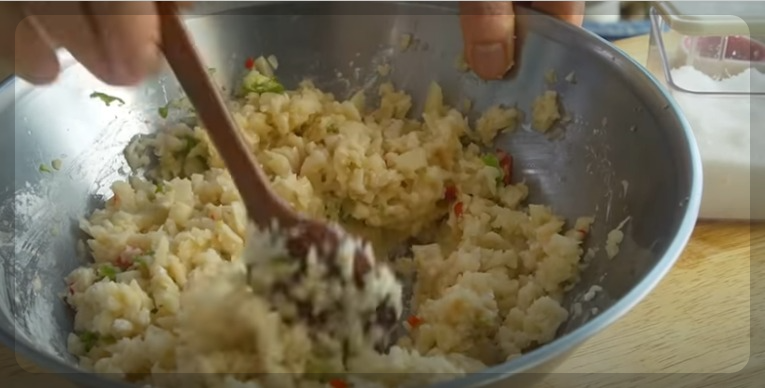 갈아준 감자에 소금 0.3큰술 넣어 간을 해주고 전분가루 넣어주며 농도를 맞춰줍니다 최종 4큰술로 맞춰주었습니다.