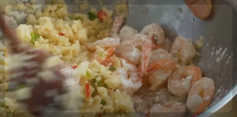 새우에도 전분 가룰 입혀줄 건데요. 서로 달라붙을 수 있도록 적당히 묻혀주세요.
