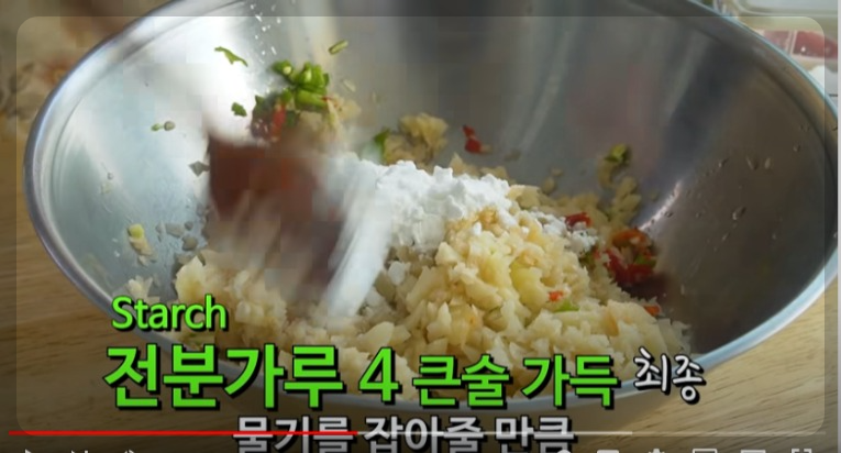 부침가루는 뭉칠 수 있으니 되도록 튀김가루, 전분가루를 사용하는 게 좋습니다.