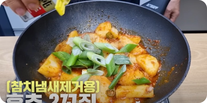 썰어놓은 대파 반대도 넣어 줍니다 혹시 남아 있을 참치 냄새 제거를 위해 후춧가루를 2꼬집 뿌려주고