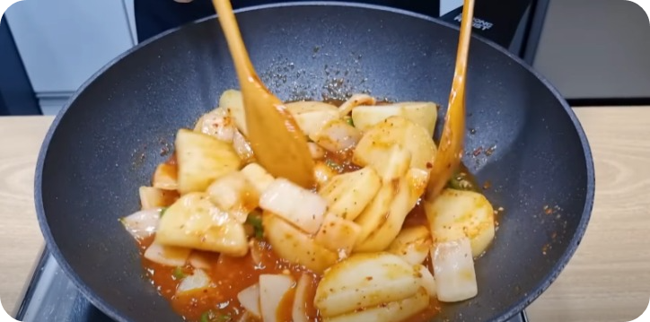노릇하게 볶아진 감자에 양파를 넣어 2분 정도 볶아주다 만들어둔 양념장을 부어줍니다.