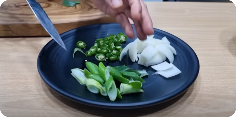 양파 번개는 굵직하게 썰어주고 대파 반대는 어슷 썰어주세요, 청양고추 2개 송송 썰어줍니다.