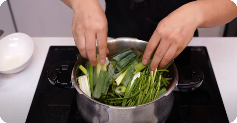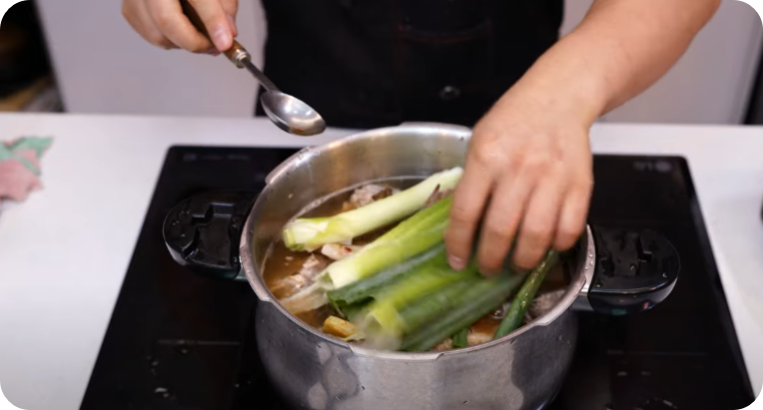 압력솥 위에 뿌려주면 압력이 빠진답니다. 압력솥뚜껑을 열어 먼저 넣어준 대파와 고깃기름을 걷어내 줍니다.