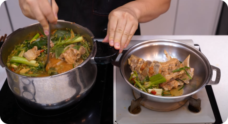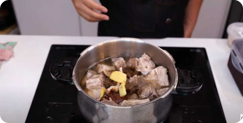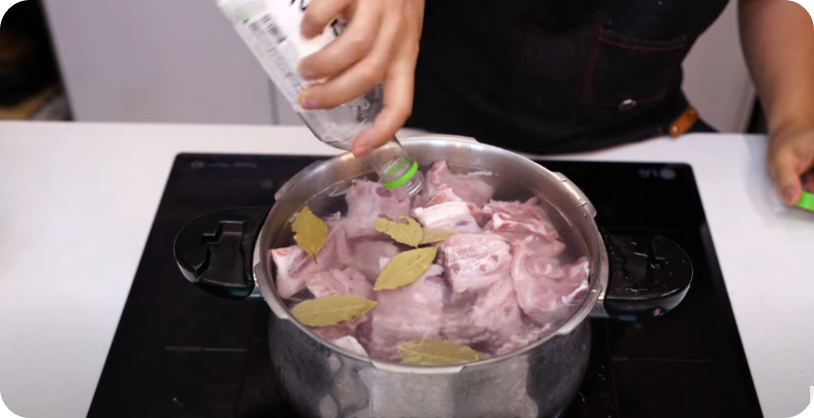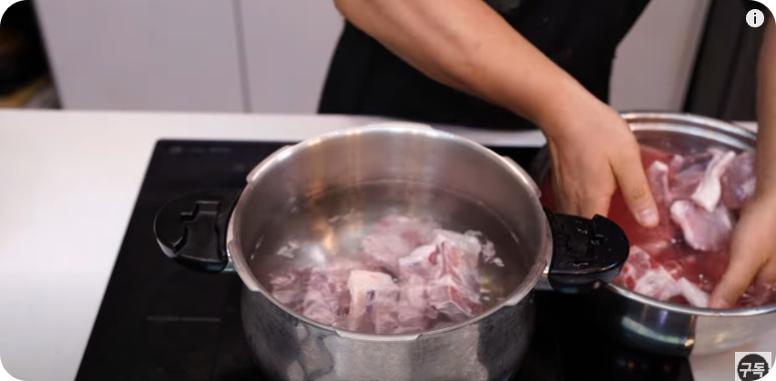 깨끗하게 씻어준 등뼈를 압력솥에 담아준 후 물은 등뼈와 비슷하게 올라오도록 부어주세요.