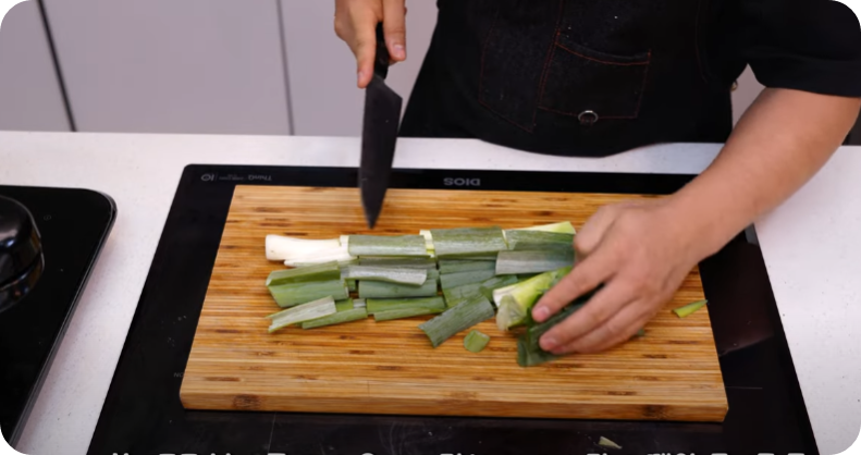 등뼈가 삶아지는 동안 부재료를 준비해 줍니다, 대파는 넉넉하게 큼직하게 썰어주고 부추도 있으면 준비합니다.