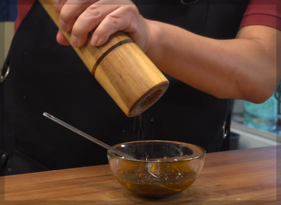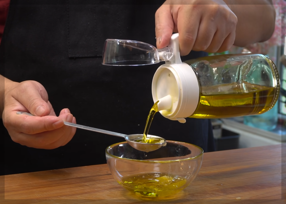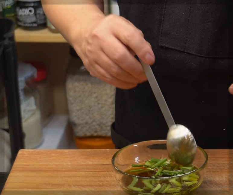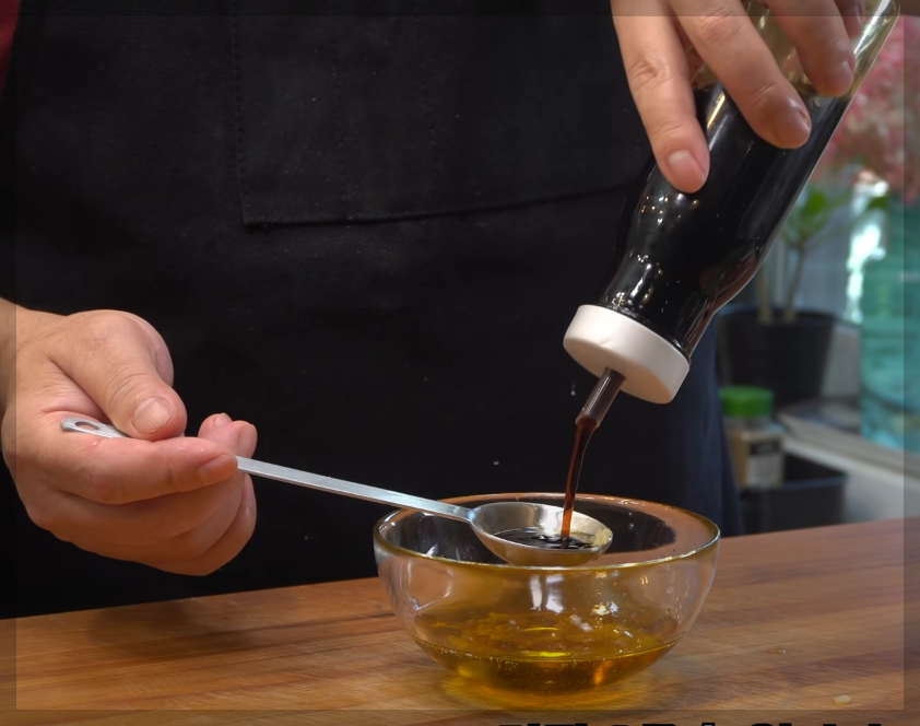 소스: 마늘 1개, 엑스트라버진 올리브유 5큰술, 참기름 3큰술, 간장 3큰 술, 후추 약간, 꿀 1.5큰술, 쪽파 약간