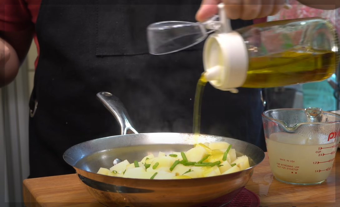 삶은 감자에 소금 반꼬집 올리브유 한 큰 술을 둘러주고 쪽파 약간 넣어줍니다. 감자가 뜨거울 때 뿌려줘야 양념을 쫙 빨아들입니다. 양념 후 뚜껑 덮어 5~10분간 두면 감자가 양념을 빨아들여 맛있어집니다.