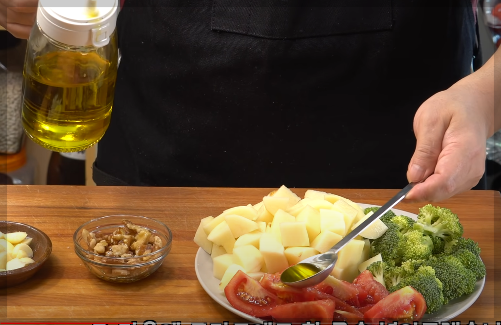 준비 재료:감자 큰 사이즈 2개, 토마토 2개, 브로콜리 1/2개, 계란 4개, 호두 3큰술, 마늘 7개, 로메인 상추 15장