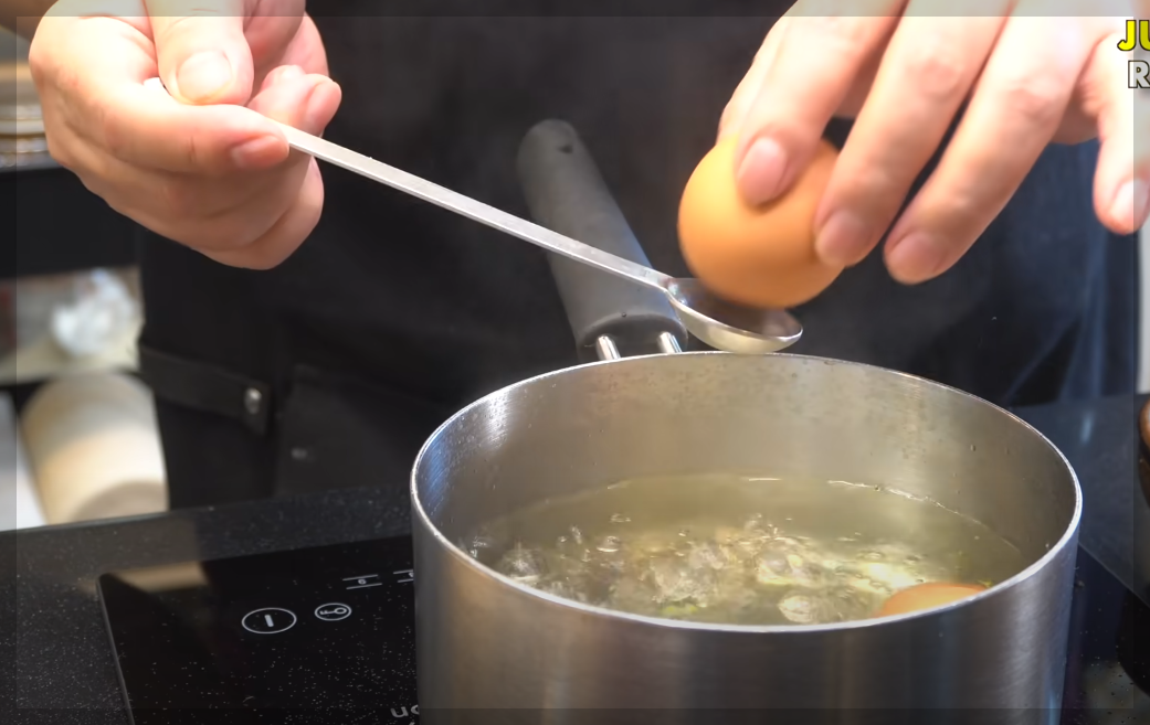 반숙으로 삶은 계란을 조심히 잘라줍니다.알려주신 방법으로 계란 삶아 10분 후 계란을 먼저 껍질을 먼저 깨준 후 찬물에 담가 까주면 쉽게 달걀을 있습니다.
