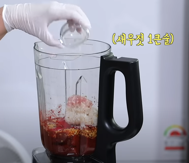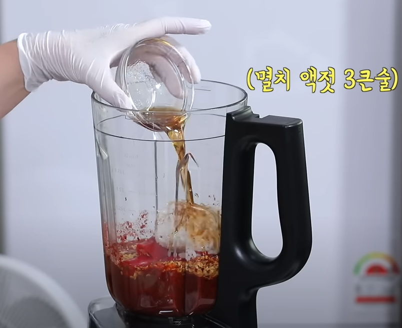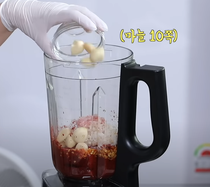 새우젓을 넣어 감칠맛을 살려주고 알싸한 겉절이를 위해 마늘 10쪽을 바로 넣어 갈아줍니다. 마지막 감칠맛을 위한