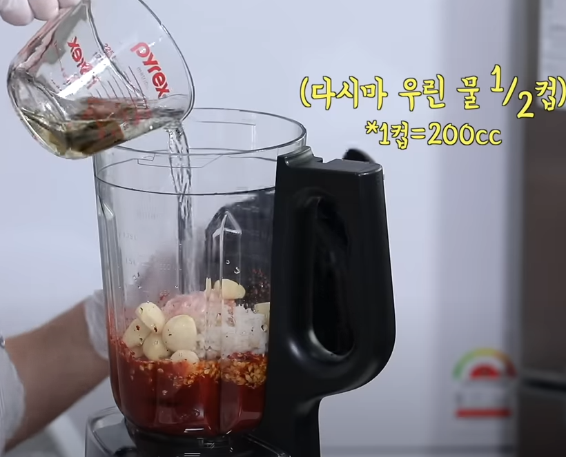 다시마 우린 물 1/2컵을 넣어 약 40초간 곱게 갈아 준비합니다.