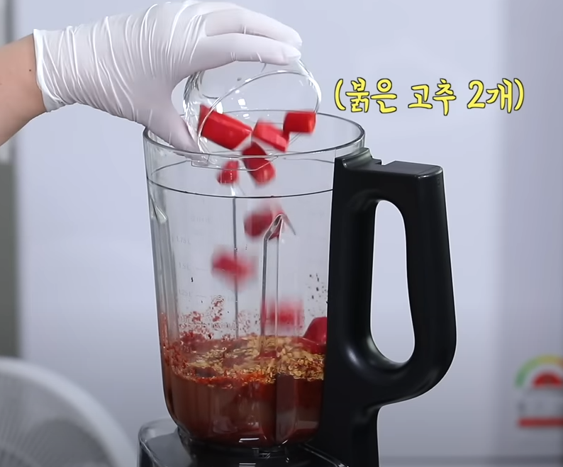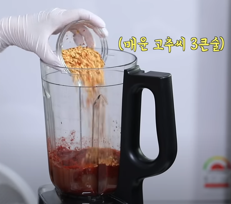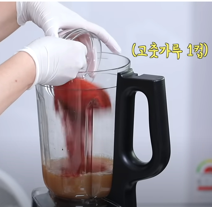 시판용 사과즙도 사용가능합니다. 고춧가루 한 컵과 매운 고추씨 3큰술 넣어 칼칼한 맛을 내주세요.