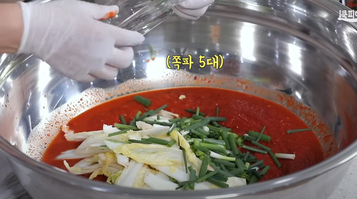 쪽파 5대 썬 것을 담아준 후 손질한 배추를 넣어 양념이 골고루 배이게 버무려줍니다. 양념이 빨갛게 잘되었습니다.