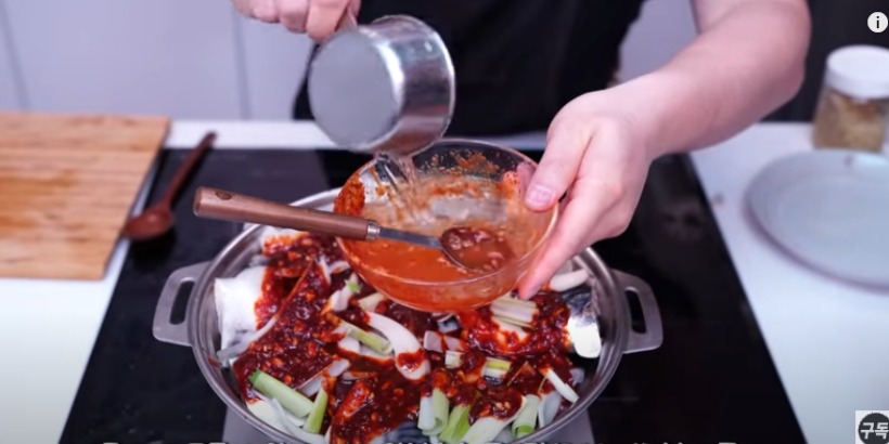 만든 양념장을 끼얹어주세요. 물 1컵을 양념장 그릇에 씻어 조림에 부어줍니다. 생선조림 불조절은 강불로 끓여 생선