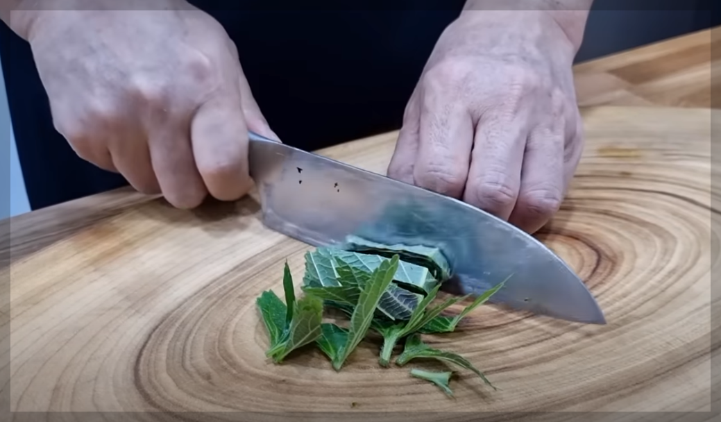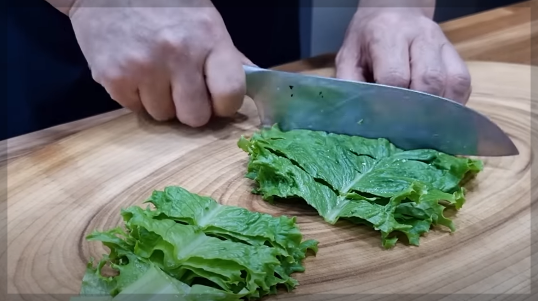 상추잎 5장 중 잎 3장은 남겨 소면 세팅 시 사용하고 나머지는 썰어줍니다,. 깻잎도 채 썰어주세요.