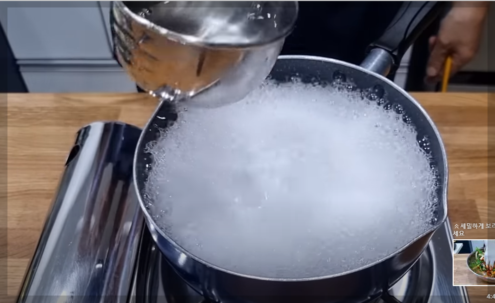 물이 끓기 시작하면 소금 1/4 큰술 놓아주세요, 소금이 들어가면 쫄깃한 면발이 맛있어집니다.