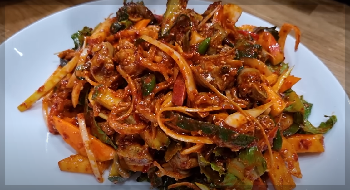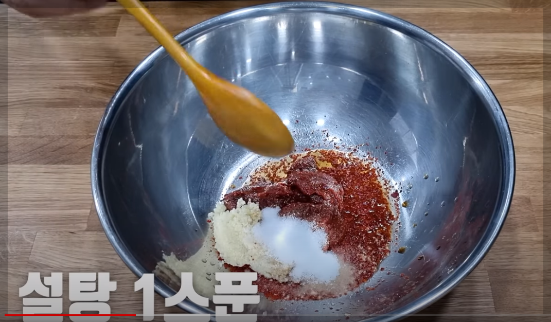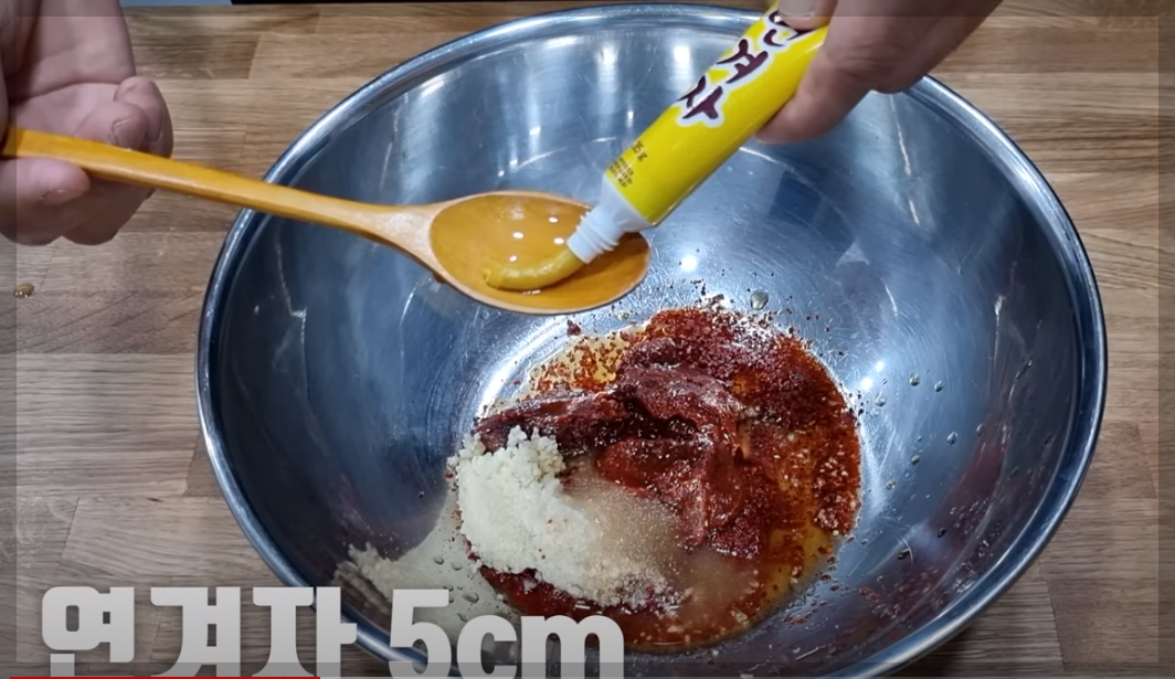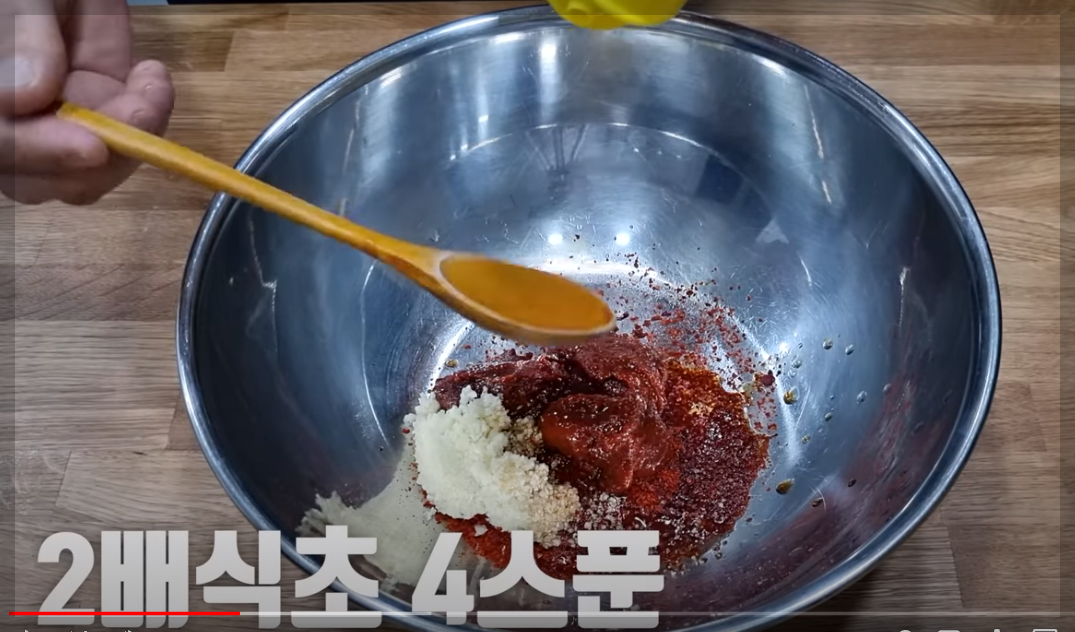 양념 재료: 고추장 3큰술, 고춧가루 3큰술, 다진 마늘 1.5큰술, 진간장 1큰술, 국간장 1큰술, 2배 식초 4큰술,