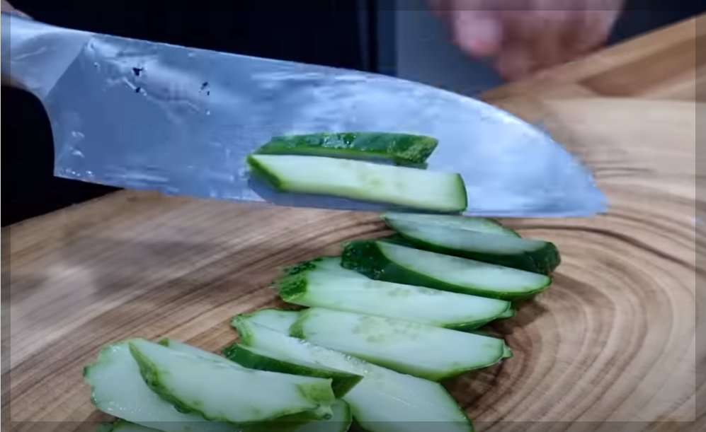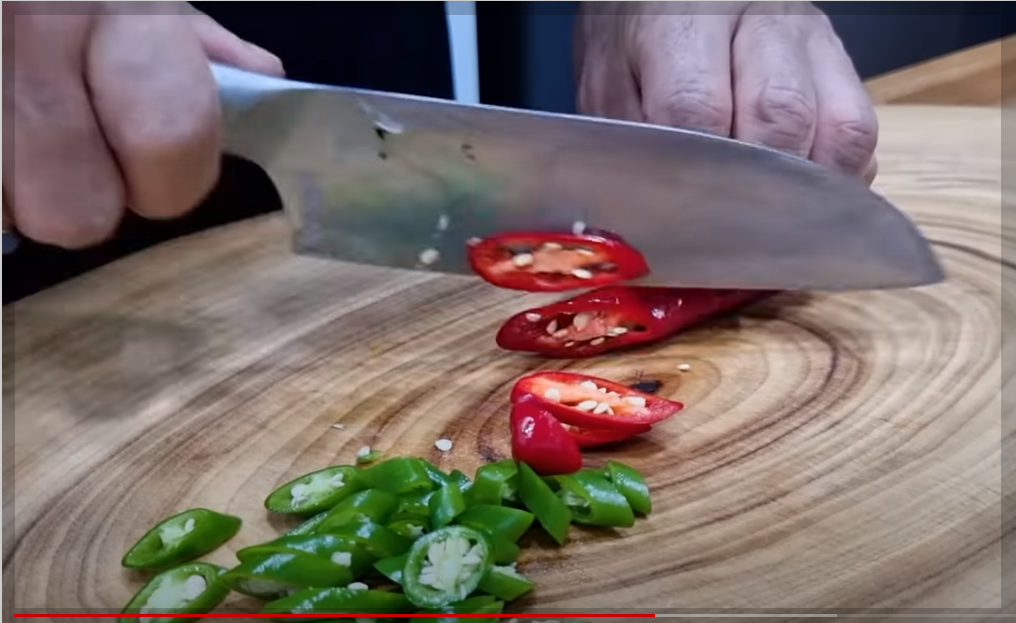 대파 흰데를 갈라주고 말아서 채 썰어줍니다. 오이 반 개는 어슷 썰어주고 청양고추, 홍고추도 썰어주세요.