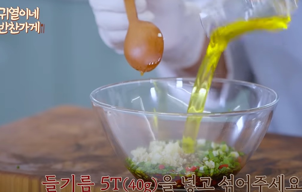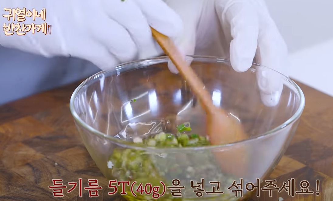 들기름 넉넉한 5큰술 을 넣고 양념을 섞어주세요.