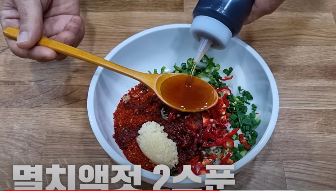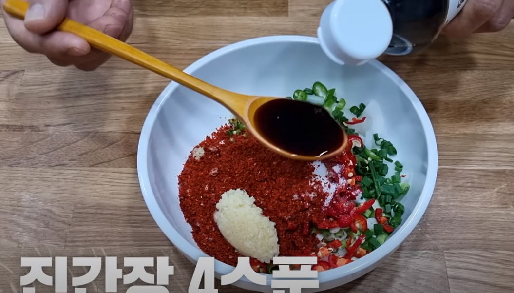 다진 마늘 1큰술, 진간장 4큰술, 멸치액젓 2큰술,매실액 1큰술, 설탕 2큰술, 생수 1/4컵, 참기름 1큰술,통깨 1큰 술