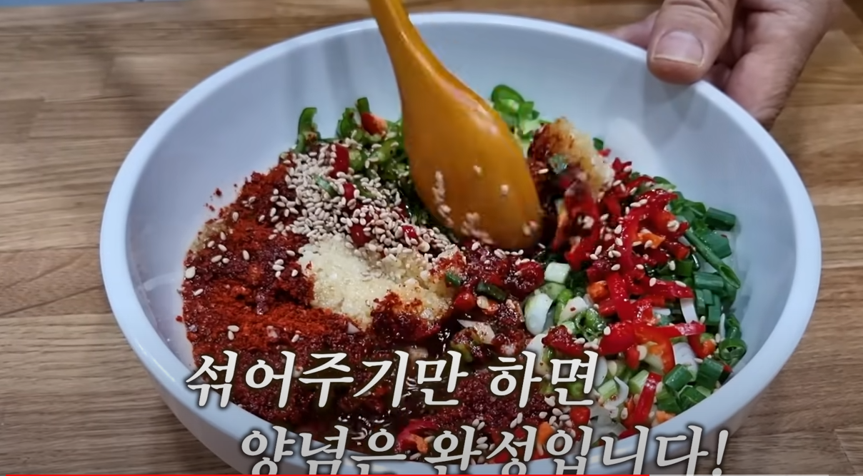 향긋함이 배가됩니다. 생수 1/4컵 넣어준 후 통깨 솔솔 뿌려 골고루 잘 섞어주면 깻잎김치 양념장 완성입니다.