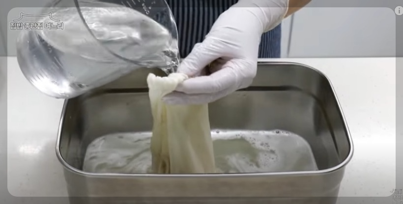 믹서 해준 배와 키위 즙을 배보자기에 넣어 짜줄 건데요. 배보자기에 즙을 넣어 주고 물 1리터를 믹서기에 휑궈 조물조물 즙을 내줍니다. 다시 한번 물을 넣어 조물조물 즙을 꼭 짜준 후 건더기를 꺼내지 말고 배보자기를 꼭 묶어 바닥에 그대로