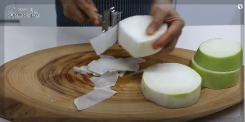 냉면육수에 들어가는 재료를 손질해 준비합니다. 무 1kg은 채칼로 최대한 얇게 썰어줍니다. 냉면 무절임무로 대신해