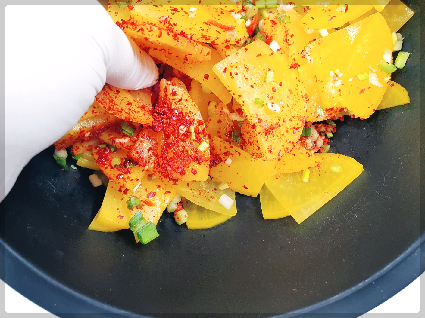 오독오독한 식감에 매콤한 고춧가루를 더해