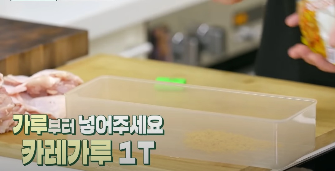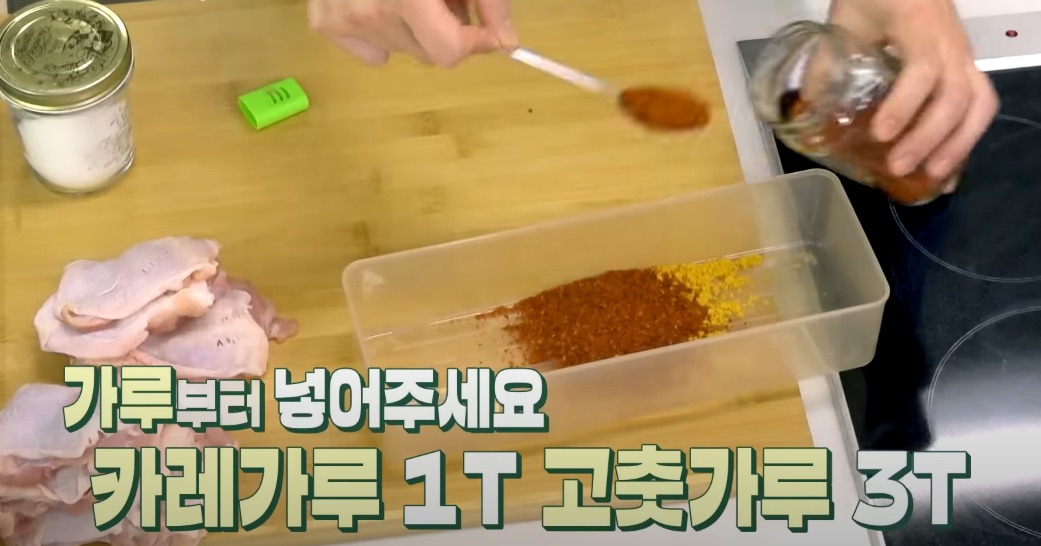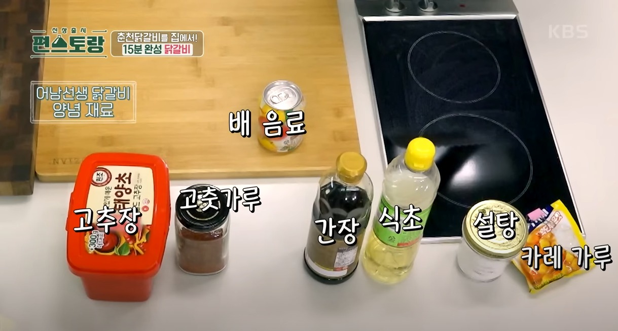 닭갈비 양념:고추장, 고춧가루, 식초, 간장, 설탕, 배음료, 카레가루 1T