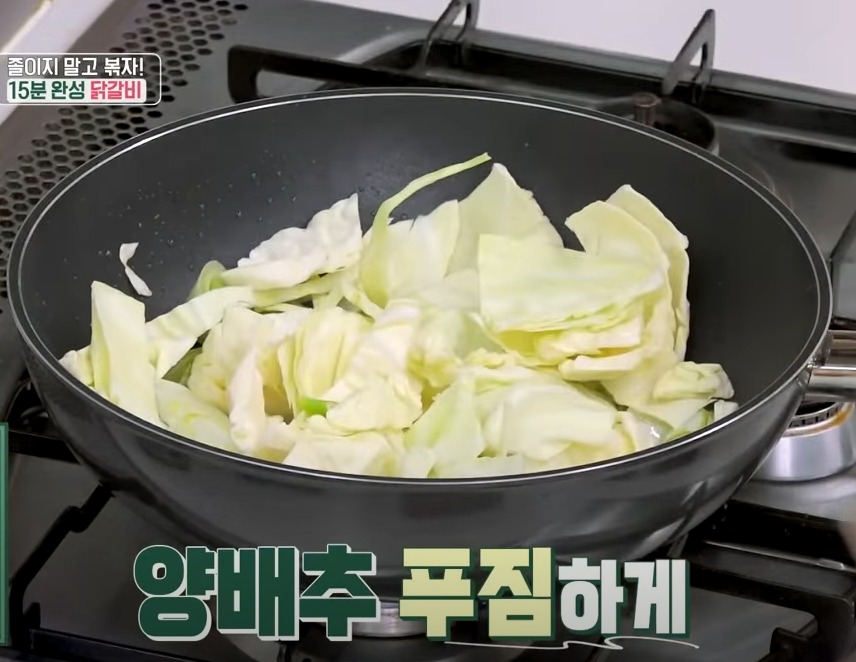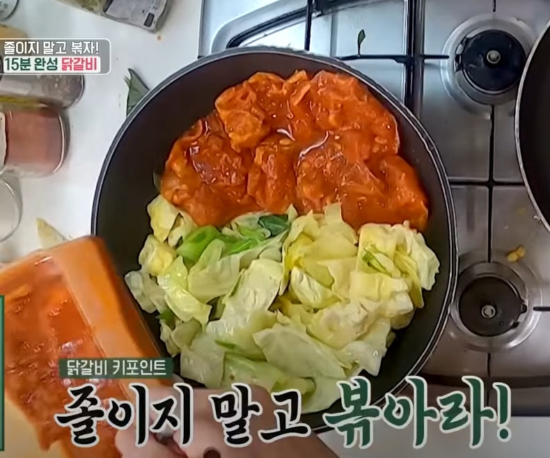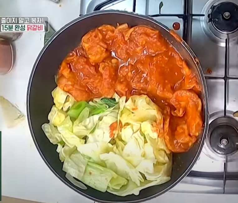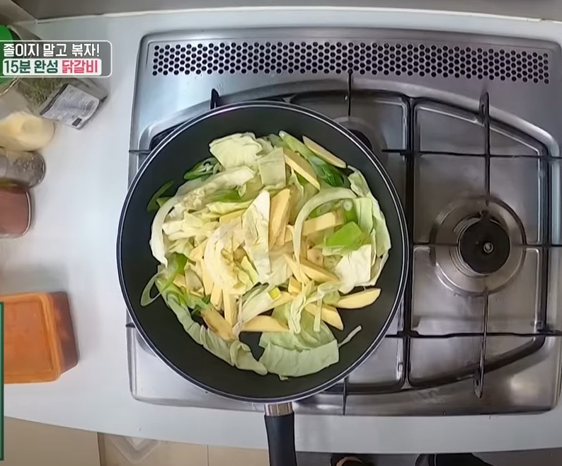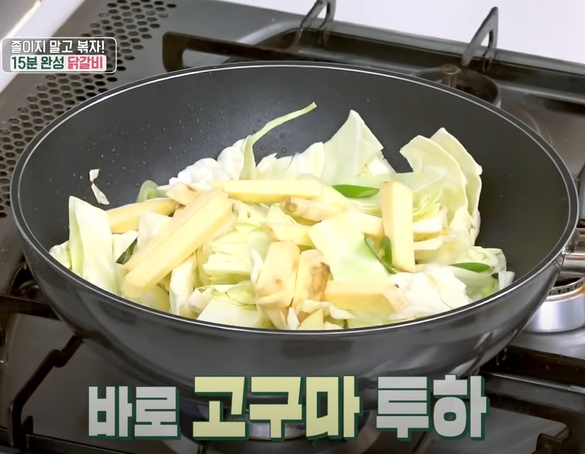 양배추 올려주고 고구마까지 올려 야채를 볶아줍니다, 고구마가 익었을쯤 양념한 닭갈비를 넣어 볶아주면 되는데요.