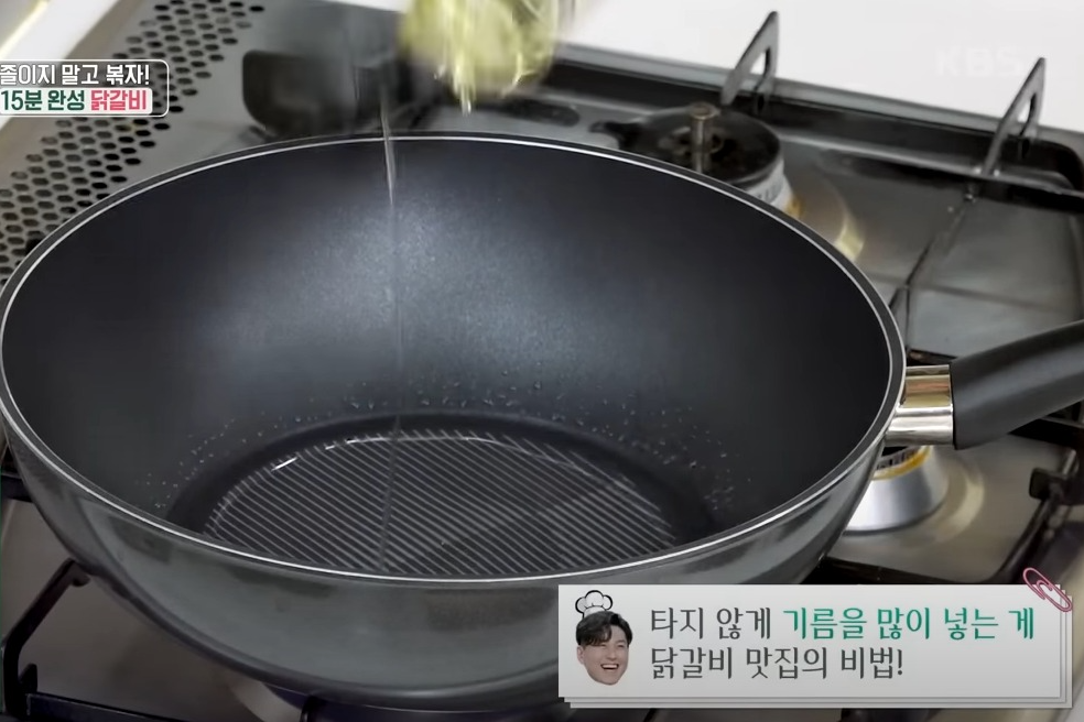 타지 않고 맛집처럼 닭갈비 만드는 법 타지 않게 기름을 넉넉하게 둘러주는 게 포인트입니다. 식용유 3큰술 넉넉하게