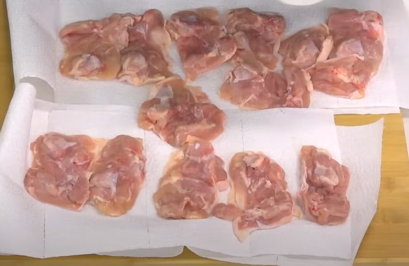 닭은 깨끗하게 세척해 준 후 물기를 제거해 주는데요, 키친타월 위에 넓게 펴준 후 키친타월로 남은 물기를