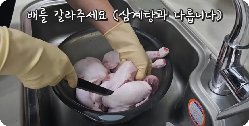삼계탕과 달리 백숙용 닭은 배를 갈라 뼈사이, 내장(피 뭉침)을 가위로 깔끔하게 긁어내준 후 흐르는 물에 깨끗이