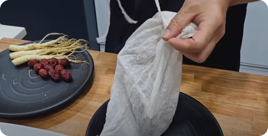 냄비에 약재를 넣은 주머니를 바닥에 넣어줍니다, 그다음 손질한 닭을 넣어주세요. 한쪽에 찹쌀 주머니를 넣고