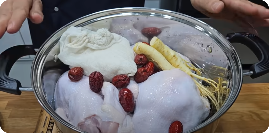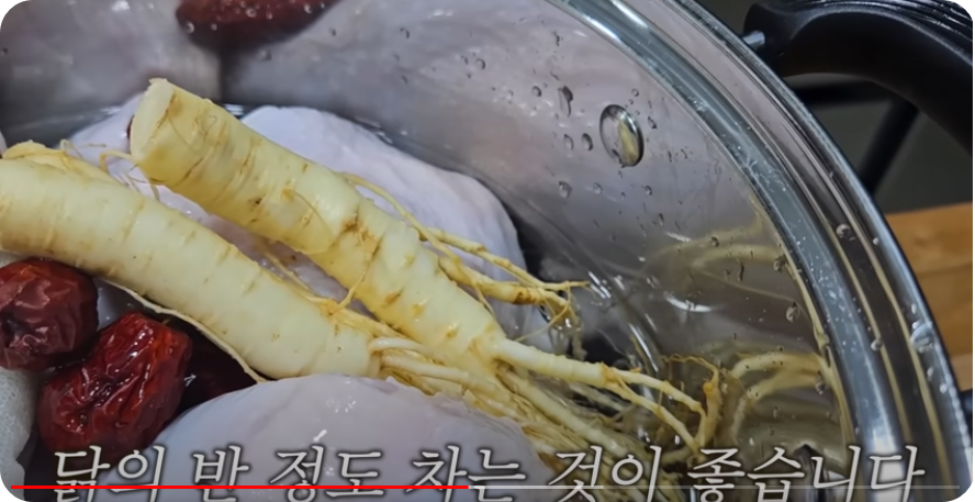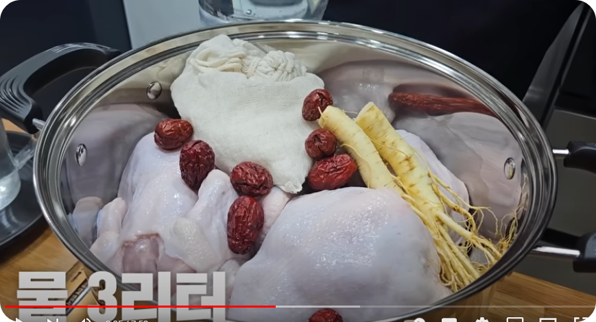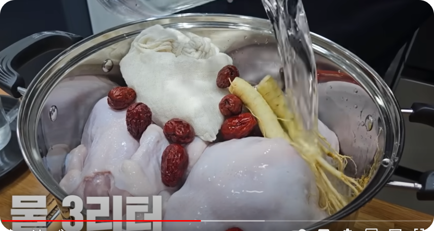 수삼과 대추를 올려준 [요. 물은 3리터 부어줍니다 물은 닭의 반정도 채워주는 것이 좋습니다. 찹쌀주머니도 물에