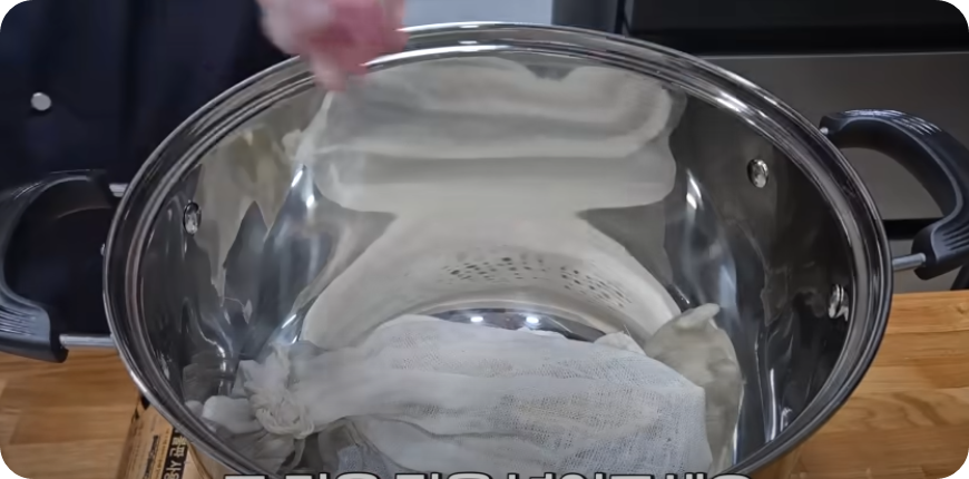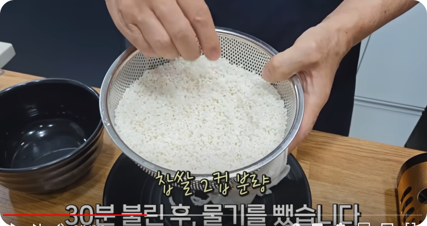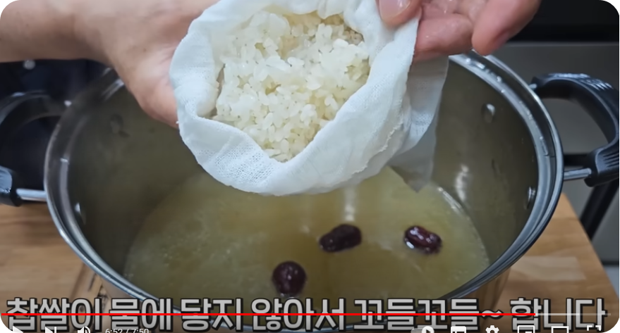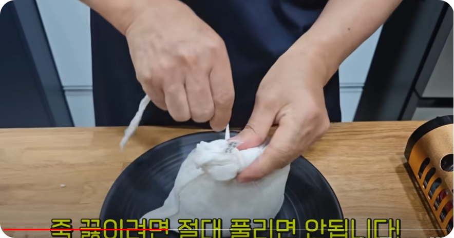 묶습니다 .찹쌀 2컵을 씻어 30분 불려 물기를 빼준 후 삼베주머니에 불린 찹쌀을 넣어 풀리지 않게 꼭 묶어주세요.