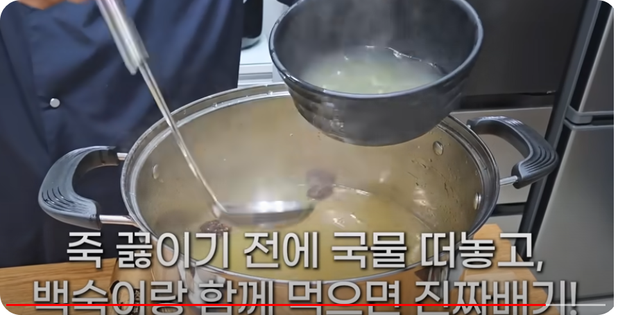 찹쌀이 물에 닿지 않아 꼬들꼬들하게 쪄졌으니 국물에 넣어 푹 끓여드시면 별미 영양죽이 빈다. 죽 끓이기 전에 한 그릇