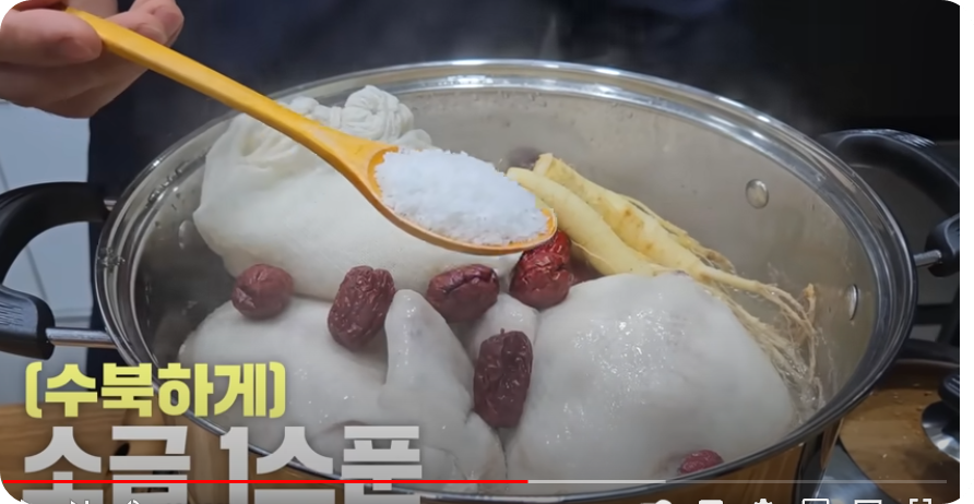 중 약불로 불여 30분 끓여줍니다. 10분 끓인 뒤 불을 꺼준 상태에서 소금 1스푼 닭 3마리 기준이니 한 마리라면