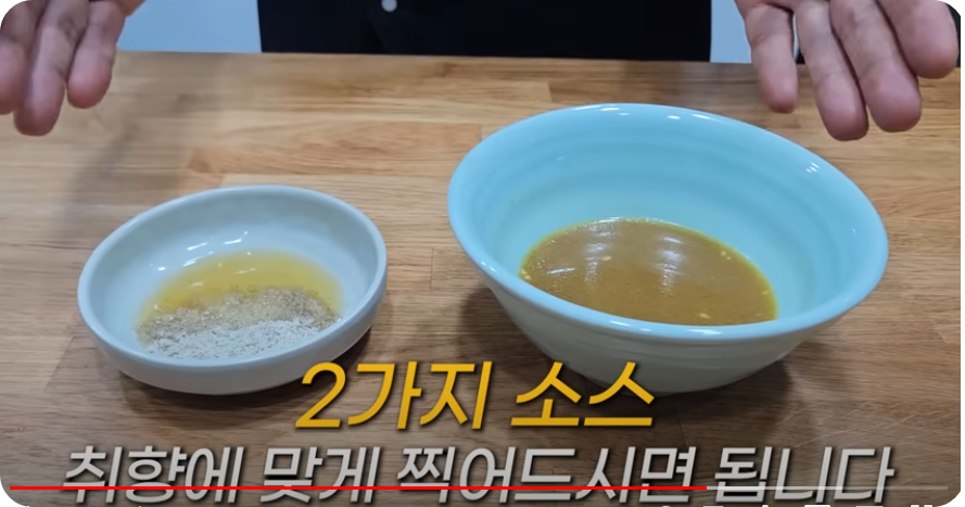 기름장은 소금 1/2스푼 후추 톡톡, 참기름 약간 넣어 저어줍니다, 2가지 소스 입맛에 맞게 골라 드세요.