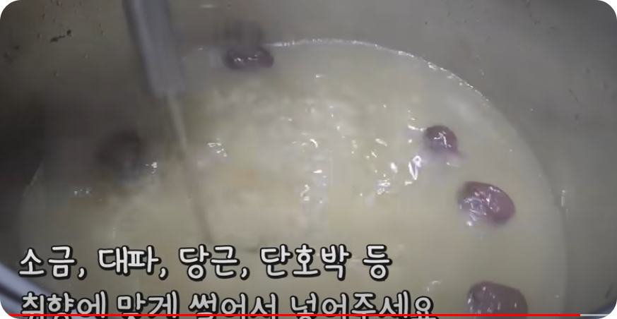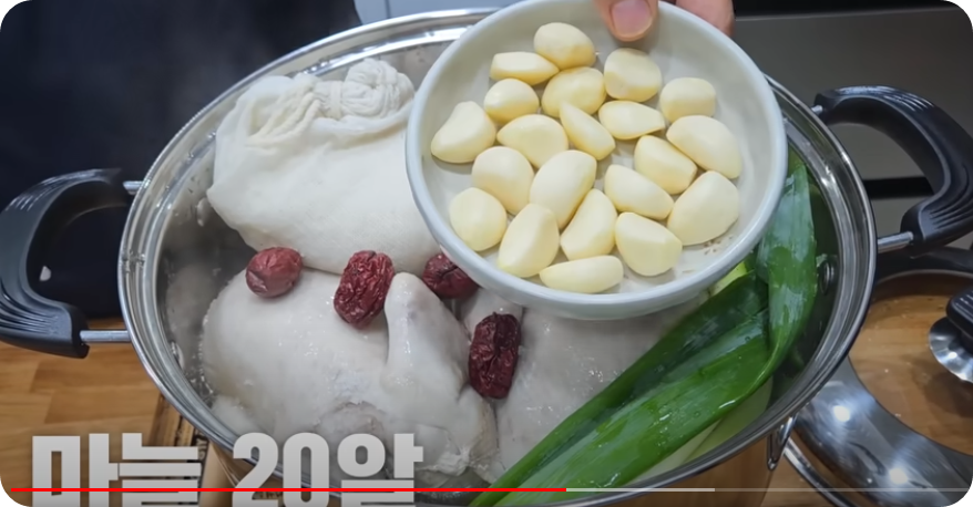 마늘 20개, 수삼 3 뿌리, 물 3리터 , 대파 2대 , 소금 수북하게 1스푼