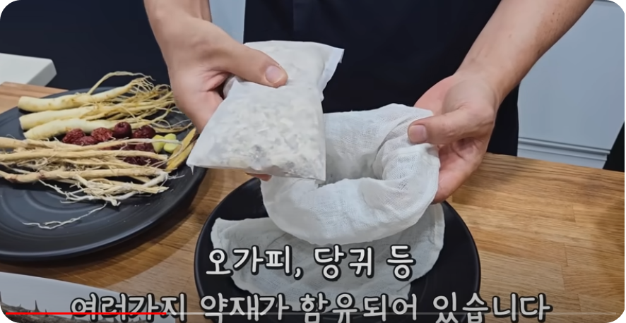 약재를 깨끗한 삼베 주머니에 넣어주는데요, 시판용 한약재 1봉과 엄나무, 황기, 생강, 감초를 넣어 삼배주머니를
