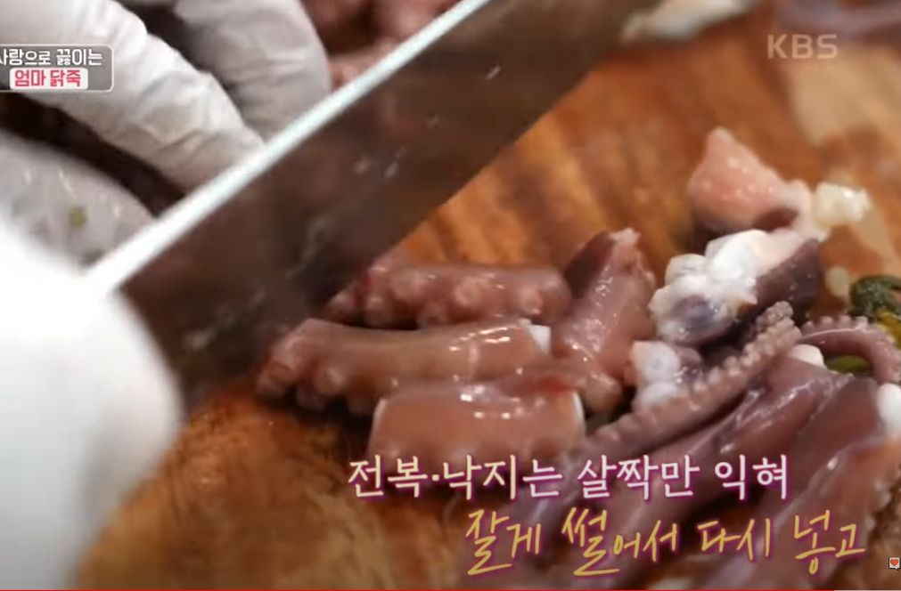 잘 저어주며 끓이는 죽에 손질한 전복과 산 낙지를 넣고 살짝 익혀준 뒤 꺼내 먹기 좋은 길이로 잘라줍니다.