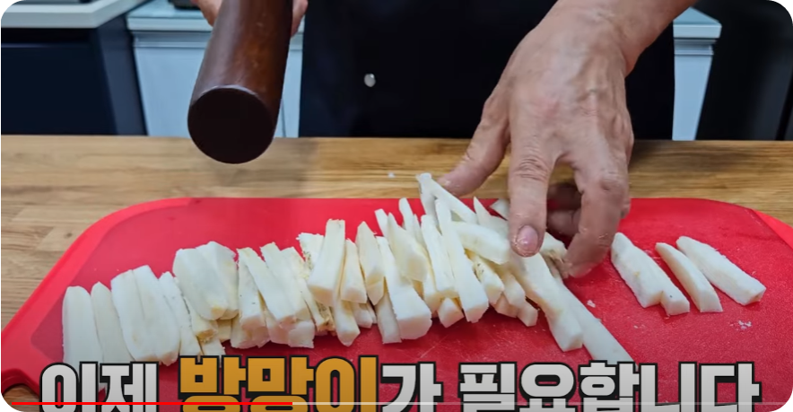 먹기 좋은 길이로 잘라 손질한 더덕은 방망이로 눌러가며 양념이 잘배이도록 해줍니다. 방망이로 두드리면
